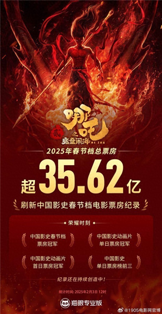 1905电影网讯据票务平台数据显示,电影《哪吒之魔童闹海》春节档(档期内票房)总票房破35.62亿,刷新中国影史春节档电影票房纪录,超《唐人街探案3》春节档(档期内票房)票房成绩,成为中国影史春节档(档期内票房)票房冠军!